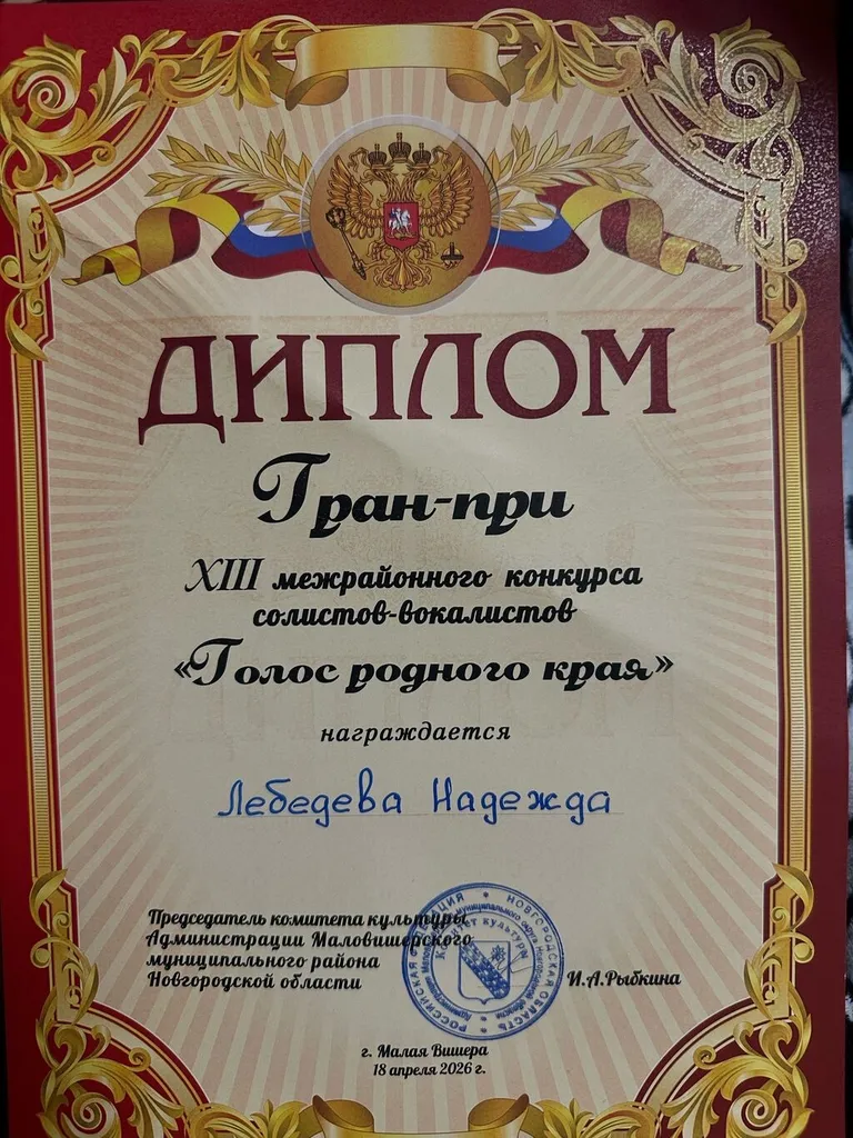 Поздравляем Лебедеву Надежду, участницу любительского объединения «С песней по жизни!», с победой в XIII межрайонном конкурсе солистов-вокалистов «Голос родного края», который прошел сегодня в Малой Вишере!!!
